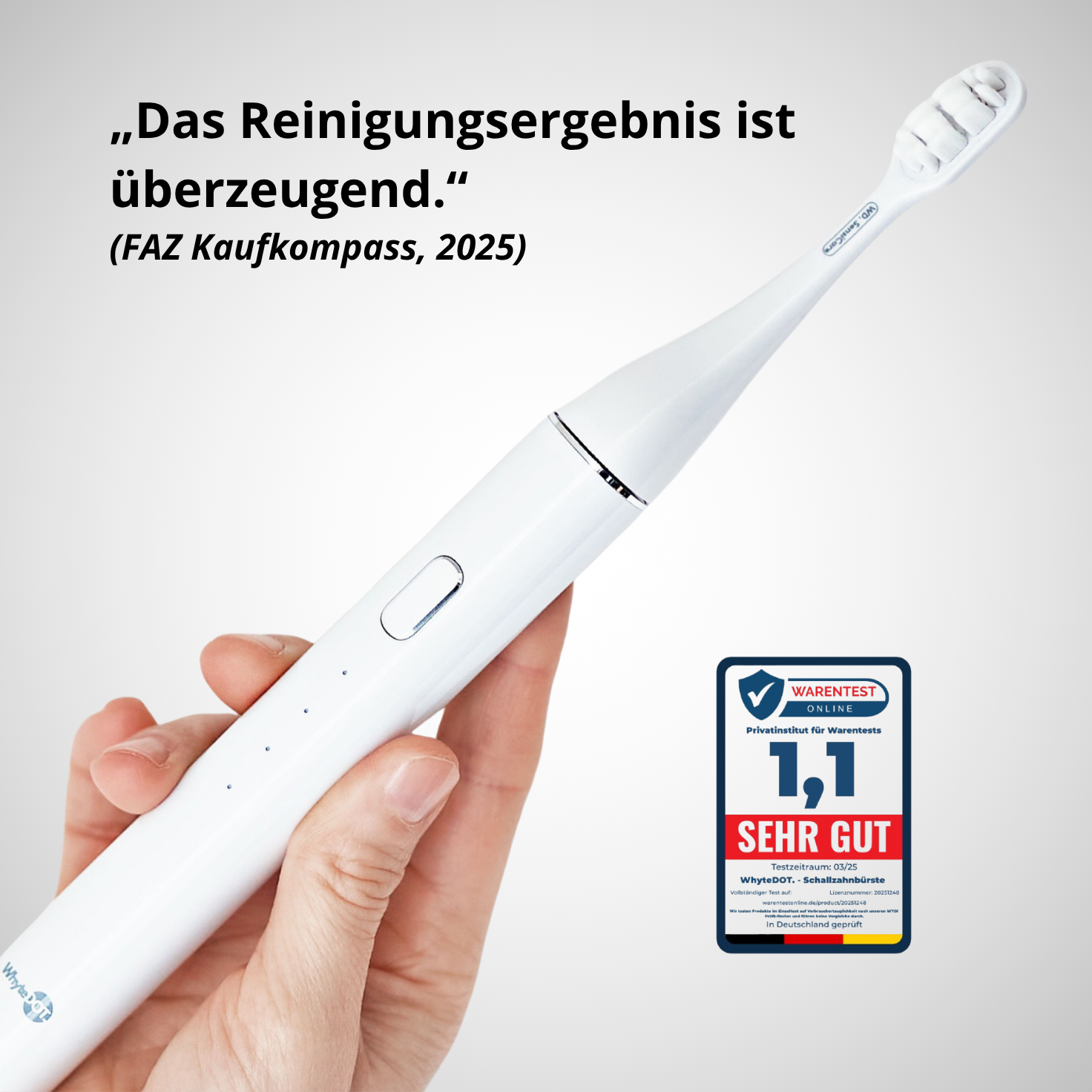 Der ist genauso ehrlich und direkt wie dieser Beitrag hier und stellt dir eine Reihe von starken Vorteilen und Produktmerkmalen der WhyteDOT Schallzahnbürste vor. Klick dich mal rein!